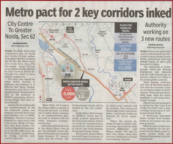 | The Delhi Metro Rail Corporation (DMRC) and the Noida and Greater Noida Authorities signed an agreement for the construction of two Metro links Noida City Centre to Sector 62 and Noida City Centre to Greater Noida — on Saturday 18th October 2014. The two links are expected to be completed in 2017 at a cost of Rs 7,413 crore. On Saturday, the agreement was signed between S.D. Sharma, the director of business development, DMRC, and Rama Raman, chairperson and CEO of Noida and Greater Noida Authority.Also present at the signing was Mangu Singh, Managing Director of DMRC. Laying the foundation for the commencement of the two proposed routes, two cheques worth Rs 29.45 crore were handed over to DMRC by Rama Raman. The Noida-Greater Noida Metro line will start from the Noida City Centre in Sector 32 and head to Greater Noida via stations in Sector 50, 51, 78, 101, 82, Dadri Road, 83, 85, 137, 142, 143, 144, 147, 153 and sector 149 in Noida. It will enter Greater Noida at Knowledge Park II, go through Pari Chowk, Sector-Alpha 1 and Sector-Alpha 2 before terminating at the Depot station, proposed to come up near Knowledge Park IV in Greater Noida. This route will be commissioned by 2018. While the entire Metro alignment has been proposed to be elevated, the route is expected to have a total of 22 stations of which 13 will be on the ground and 7 at an elevated level.
